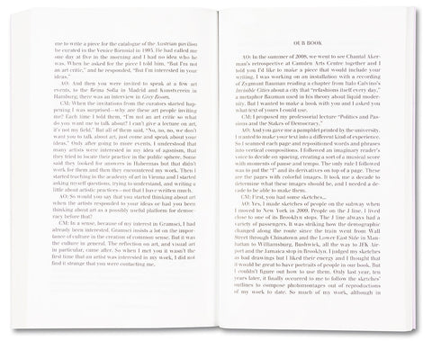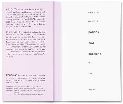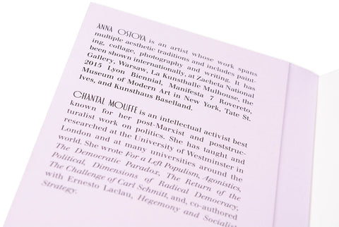 In 2009, the artist Anna Ostoya created a booklet with textual collages using an essay by the political theorist Chantal Mouffe, ‘Politics and Passions: The Stakes of Democracy’ (2002). In the essay, Mouffe critiqued the then-dominant ‘beyond left and right’ politics of neoliberalism and warned of its dangers – the rise of right-wing populist parties. Fascinated by Mouffe’s strikingly prophetic ideas, as well as her bold call to fight the status quo in order to radicalise democracy and to prevent violence, Ostoya returned to the booklet in 2019. She composed for it a series of portraits based on sketches of people on the New York City subway and on reproductions of her paintings and collages from the preceding decade. She also conducted a conversation with Mouffe about the politics of the last forty years, about the contemporary moment and about art, which is included in this publication.